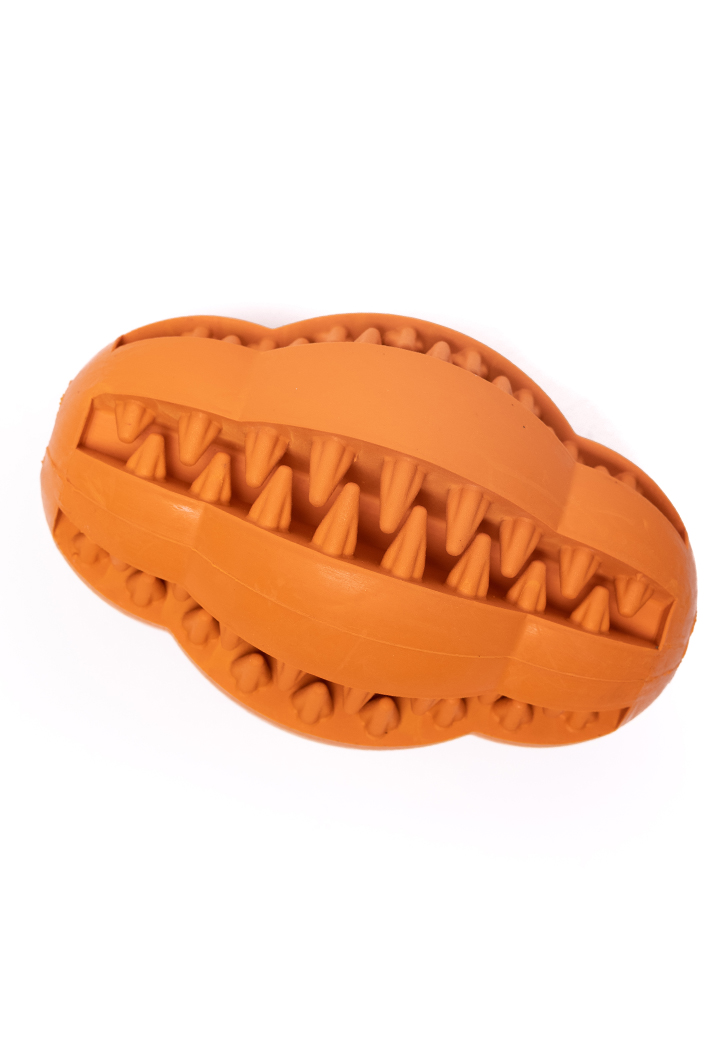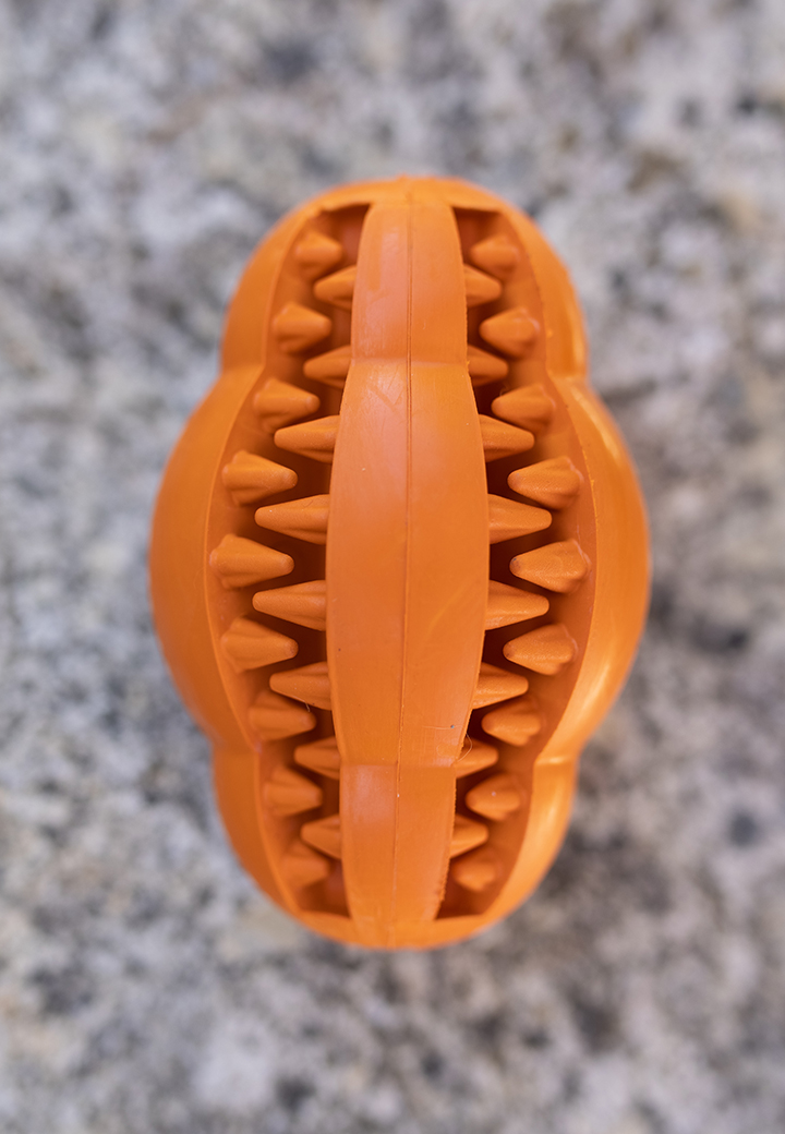 Nicht ganz so derb wie beim Rugby unter Menschen kann dieses Spielzeug von Hunden genutzt werden. Die weichen Noppen dienen nicht nur zum Anreiz der Kautätigkeit, sondern geben dem Tierhalter auch die Möglichkeit Leckerchen darin zu verstecken. So findet der Vierbeiner Beschäftigung dabei selbst zu seiner Belohnung zu gelangen und reibt mit dem festen Rugby ganz nebenbei auch Verschmutzungen von den Zähnen.